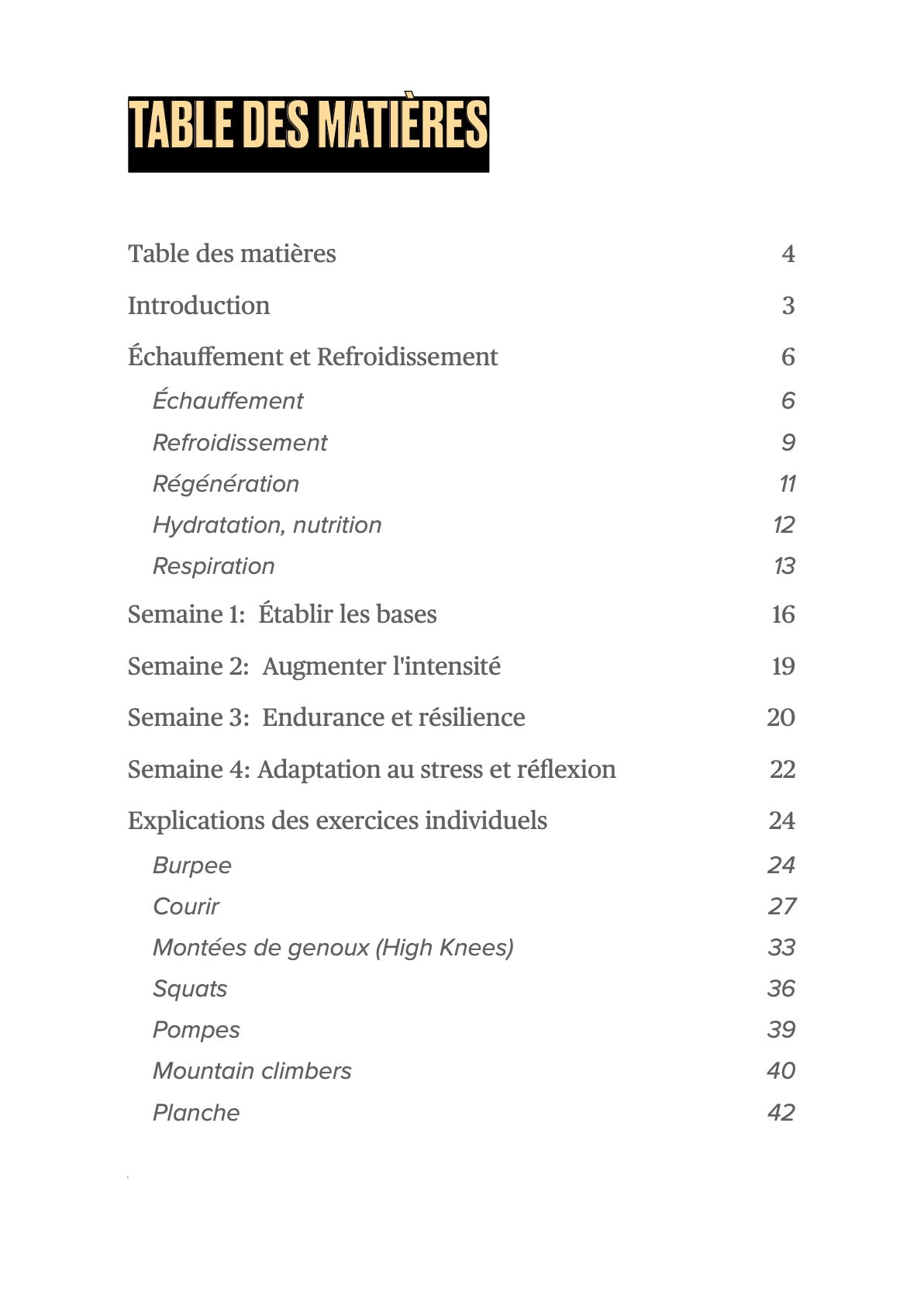 - Un programme complet de 4 semaines : Plans d'entraînement détaillés pour vous guider vers une meilleure condition physique et mentale, étape par étape.