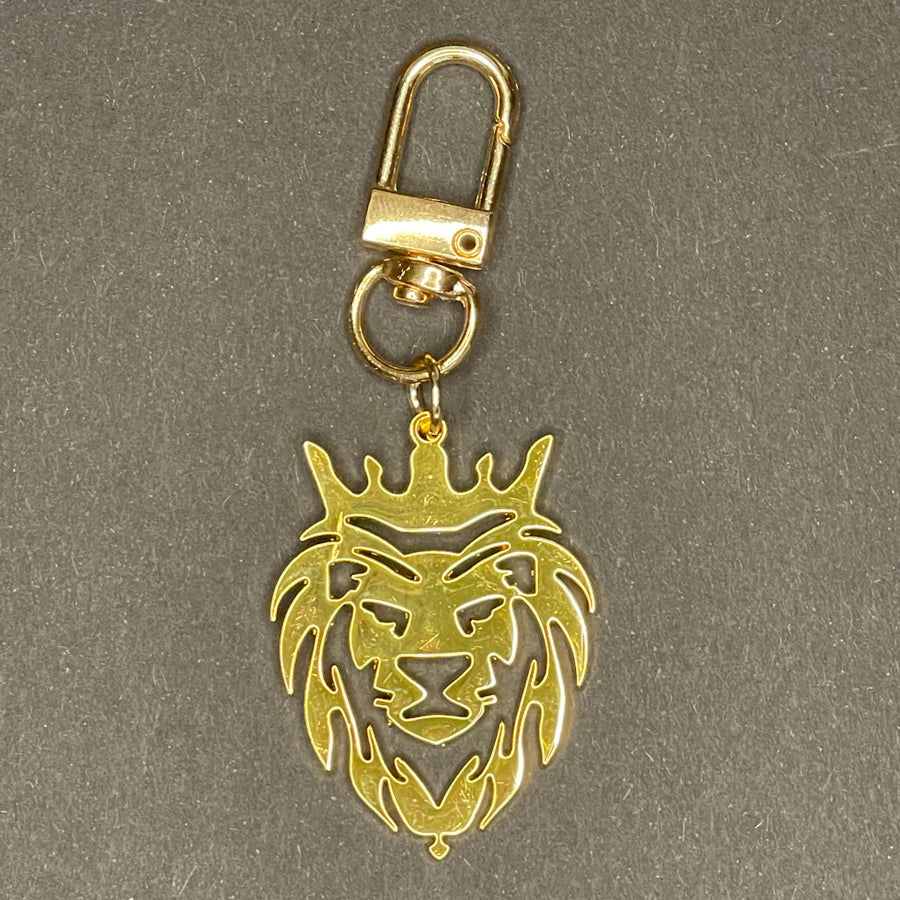 Goldfarbener Schlüsselanhänger mit gekröntem Löwenkopf 3 auf 4 cm.